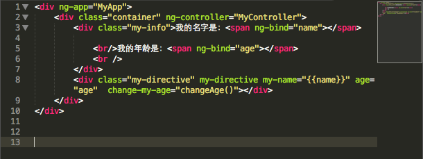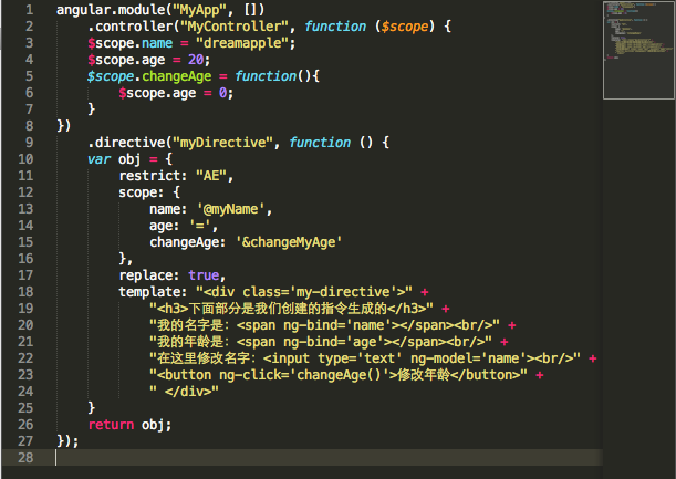 使用方法:在元素中使用属性,好比这样<div my-directive change-my-age="changeAge()"></div>,注意,属性的名字要用-将多个个单词连接。
