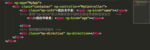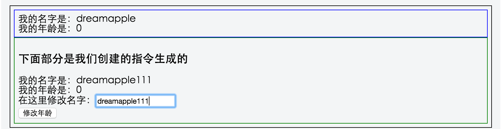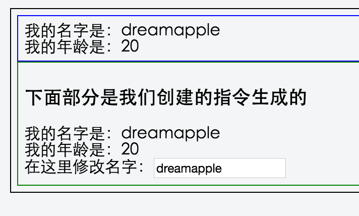 使用方法:在元素中使用属性,好比这样<div my-directive age="age"></div>,注意,数据的双向绑定要通过=前缀标识符实现,所以不可以使用{{}}。