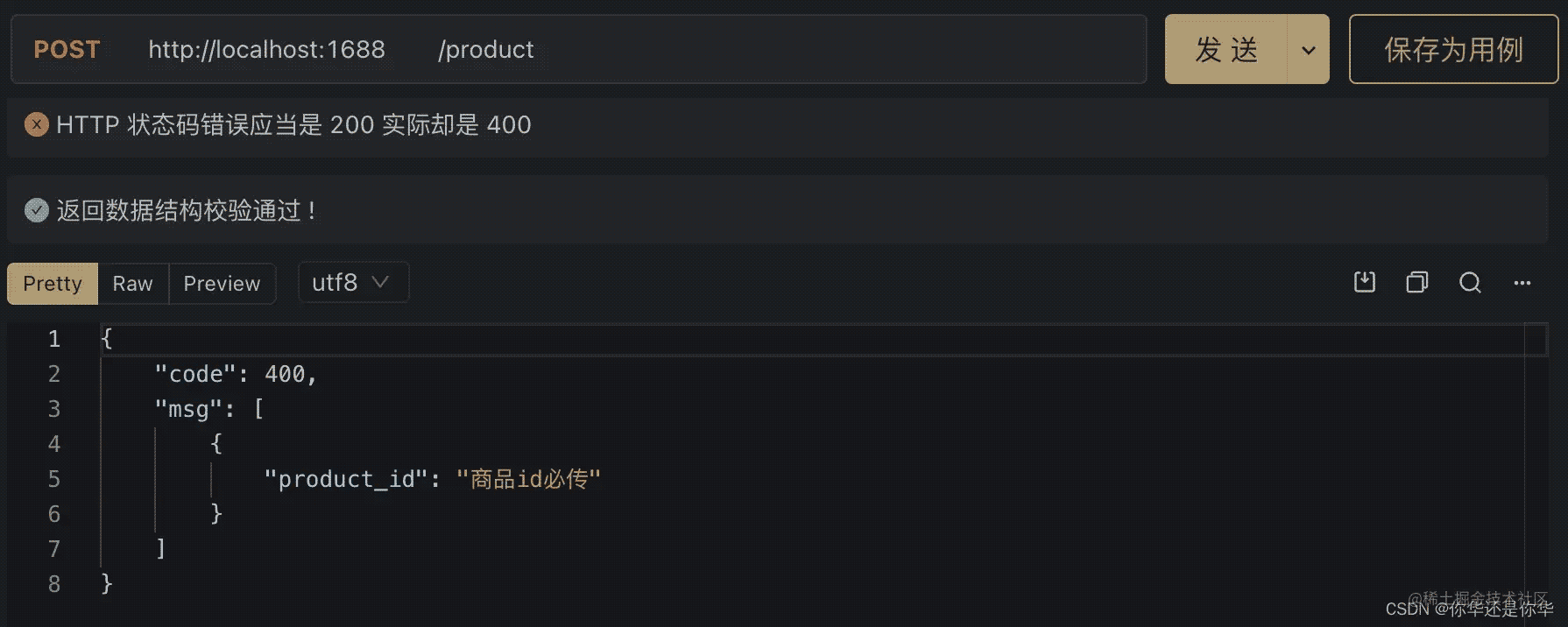可以看到get请求成功,但是在post请求时,我们没有传必传参数,所以出现了报错。我们尝试将必传参数加上: