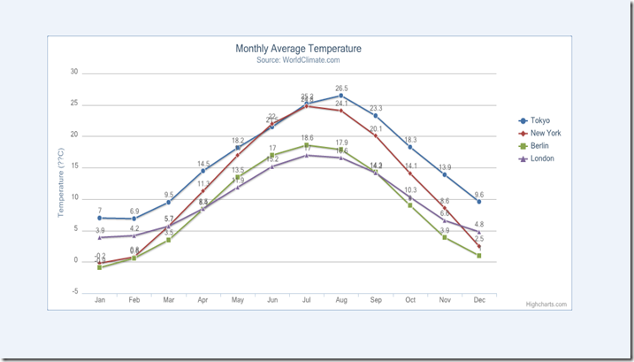 data: [7.0, 6.9, 9.5, 14.5, 18.2, 21.5, 25.2, 26.5, 23.3, 18.3, 13.9, 9.6]//每条线的数据