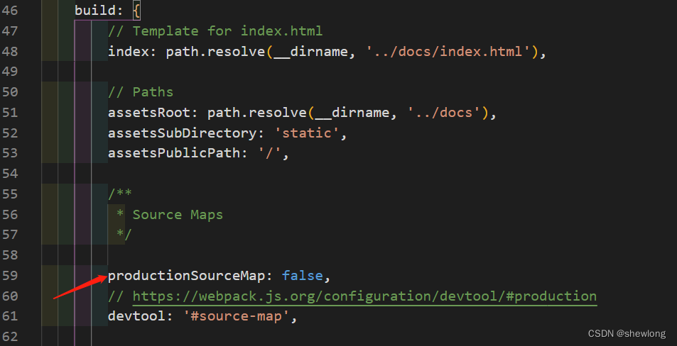 webpack中有一项productionSurceMap设置,productionSourceMap是什么?是打包后是否让每个js文件都生成一个.map文件?true代表生成,false代表不生成。那么.map文件作用是什么?因为打包后代码都是经过压缩加密的,如果出现报错情况,输出错误信息,不会知道是哪里代码有问题,.map就行没有加密一样,能准确输出哪一行出错了。但是在生产环境中,我们是不需要输出错误信息的,在webpack.config.js中找到productionSourceMap选项,并关闭它