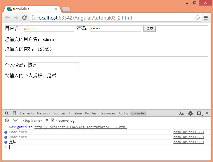 由于name和pword不是在InfoContoller控制器中定义的,我们在控制台中输出$scope.name和$scope.pword显示为undefined.