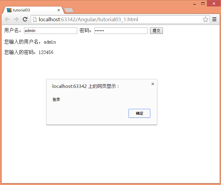 在控制器中可以做一些初始化工作,例如这里我们將用户名和密码文本框中的内容初始化为”admin”,”123456”。还可用于事件处理,我们通过ng-click指令声明按钮的点击事件处理函数为login(),在控制器中通过$scope.login = function()...进行事件绑定。