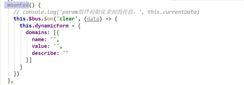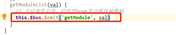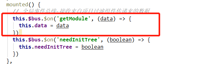 接着,在需要接收数据的组件上绑定一个全局事件,通过使用this.$bus.$on,图中的getModule即事件名称,data接收传递来的数据。