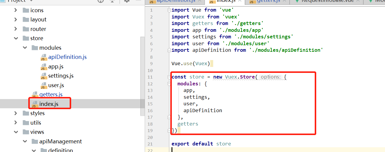 最后,要对外暴露这些属性才可以,脚手架中vuex的配置处理在这里: