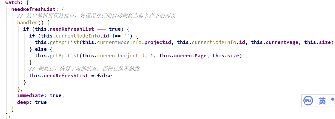 我在 watch 里监视了属性needRefreshList,这个属性是我用来标记是否需要刷新列表用的,所以我要关注needRefreshList值的变化,当产生变动的时候,就去执行handler()方法里的事情。