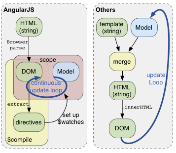 Angular:Angular模版的不同之处,在于它是基于DOM的而不是基于字符串的。模版依然需要在HTML中写入一些字符串,但依旧是HTML(不是通过在里面嵌入模版)。浏览器把HTML转换为DOM,然后DOM成为了compiler(angular的模版引擎)的输入。Compiler查找directives,依次在model中设置watches。得出的结果,是一个一直更新的view,不需要重新拼接model与template。model成为了view的唯一数据来源(single source of truth)。