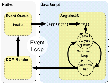这图表和后面的例子,描述了angular如何通过浏览器event-loop(所有的时间处理函数,以及timer执行的函数,会排在一个queue结构中,利用一个无限的循环,不断从queue中取出函数来执行,这个就是event-loop。来自http://wiki.nodejs.tw/nodejs_from_scratch/javascript-yunodejs/2-1-event-loop)来进行交互。
