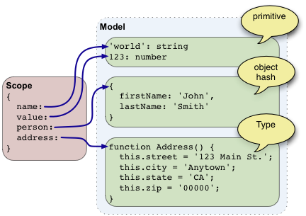 Model,可以理解为数据对象。它被用作与模版结合,以产生视图。为了将model写入到视图中,model必须被scope所引用。与很多其他框架不一样,angular对model没有任何限制与要求。不需要额外添加class,也不需要通过特殊的特权方法去访问或者改变model。Model的数据类型,可以是原始的类型(string、number……),可以是键值对象({a:1,b:2}),也可以是函数(function() {…})。简要地说,angular的model只需要是一个普通的javascript对象。
