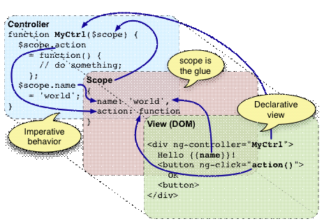 Controller是在view背后的代码(-_-!)。它的职责是构建model,并通过回调函数,将其(model)推送到view中。View是当前scope到template(HTML)的映射(翻译得有点勉强...)。Scope是指挥model到view以及向controller发送event的纽带。