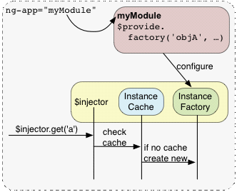 Injector是一个服务定位器。每一个Angular应用,都会有一个单独的injector。Injector提供一个通过名称查找对象实例的途径。Injector会在内部cache中保持所有对象实例,所以重复调用相同的名称时,返回的都是同一个对象实例。如果对象不存在,那么它会请求实例工厂(instance factory)去创建一个新实例。