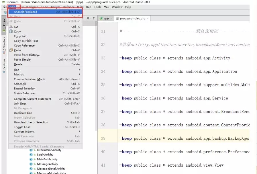 - 在菜单栏的Edit下拉菜单中选择AndroidProGuard选项。