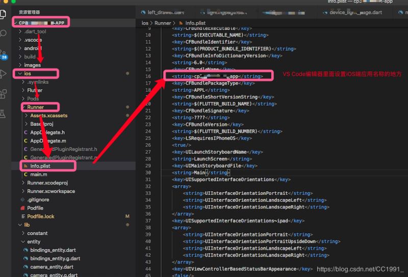 1、由于苹果的icon设置有点特殊,建议开发者直接通过xcode编辑器打开项目的iOS文件夹,然后在xcode编辑器里面进行iOS端的应用图标设置。但是iOS端的应用名称有两种设置方式:第一种就是用VS Code编辑器打开项目,找到iOS目录下的ios—>Runner—>Info.plist文件,然后找到对应的设置应用名称的键值对进行设置;第二种方式就是直接在xcode里面Runner—>Runner—>Info.plist文件里面对应的设置应用名称的键值对进行设置,具体操作如下所示: