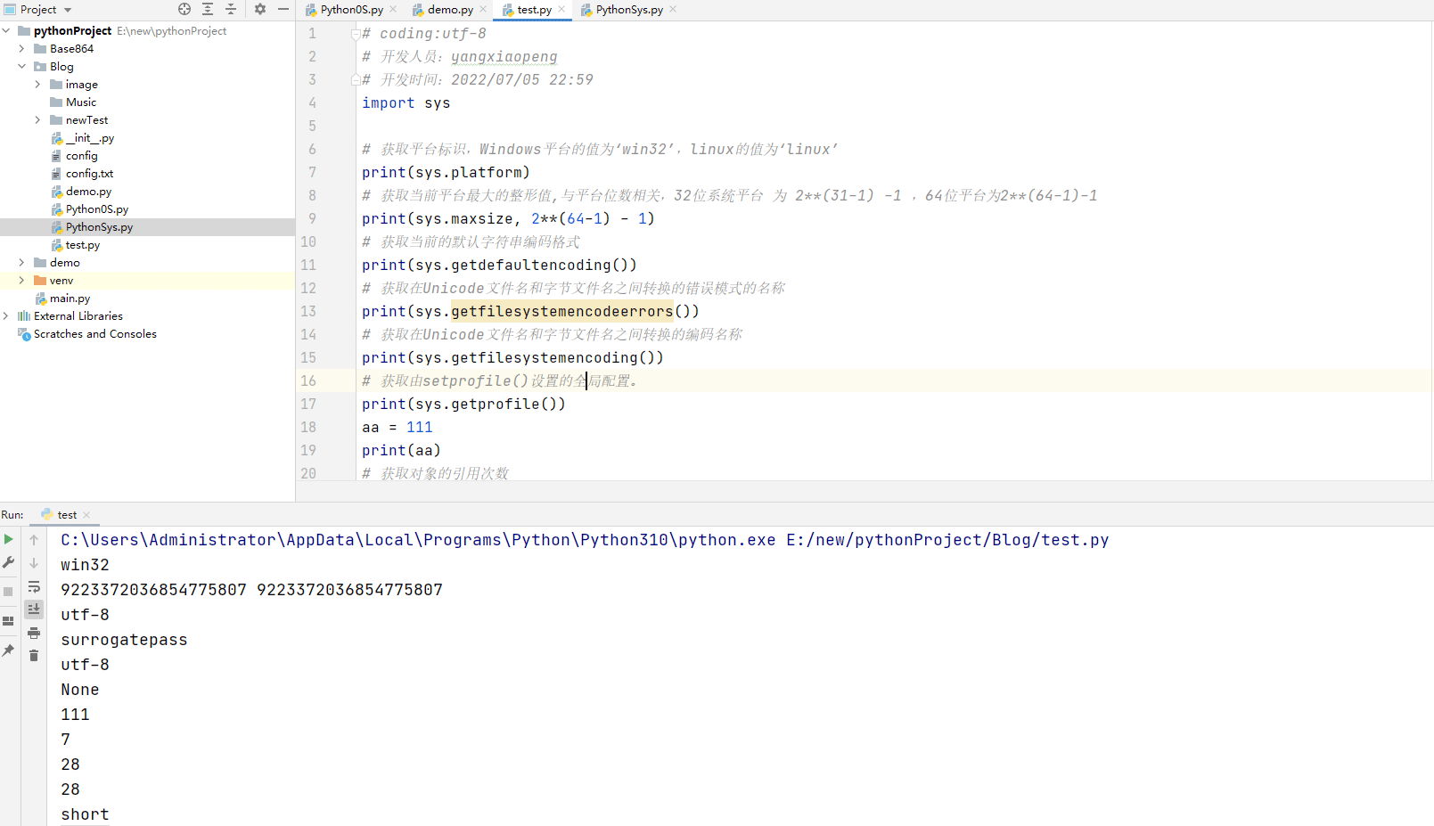 # coding:utf-8 import sys # 获取平台标识,Windows平台的值为‘win32',linux的值为‘linux' print(sys.platform) # 获取当前平台最大的整形值,与平台位数相关,32位系统平台 为 2**(31-1) -1 ,64位平台为2**(64-1)-1 print(sys.maxsize, 2**(64-1) - 1) # 获取当前的默认字符串编码格式 print(sys.getdefaultencoding()) # 获取在Unicode文件名和字节文件名之间转换的错误模式的名称 print(sys.getfilesystemencodeerrors()) # 获取在Unicode文件名和字节文件名之间转换的编码名称 print(sys.getfilesystemencoding()) # 获取由setprofile()设置的全局配置。 print(sys.getprofile()) aa = 111 print(aa) # 获取对象的引用次数 print(sys.getrefcount(aa)) # 获取对象的大小,单位为字节 print(sys.getsizeof(aa)) i = 100 print(sys.getsizeof(i)) # 获取repr()函数对浮点数x的行为方式,short表示repr(x)生成短字符串 print(sys.float_repr_style) # 获取 unicode 编码的最大值 print(sys.maxunicode) # 获取本地的字节顺序, 不同的CPU采用的字节顺序可能不一样; # 常见的有little-endian和big-endian; # little-endian是指将低位字节放在前面,高位字节放在后面,big-endian刚好相反; # sys.byteorder返回值为little为little-endian,big为big-endian print(sys.byteorder) # 获取 模块搜索路径的列表 , 由环境变量PYTHONPATH进行初始化及安装时的默认值组成 print(sys.path) # 获取python模块的信息 print(sys.modules) # 返回值是一个以模块名为key的字典,查看os模块的信息 print(sys.modules['os'])