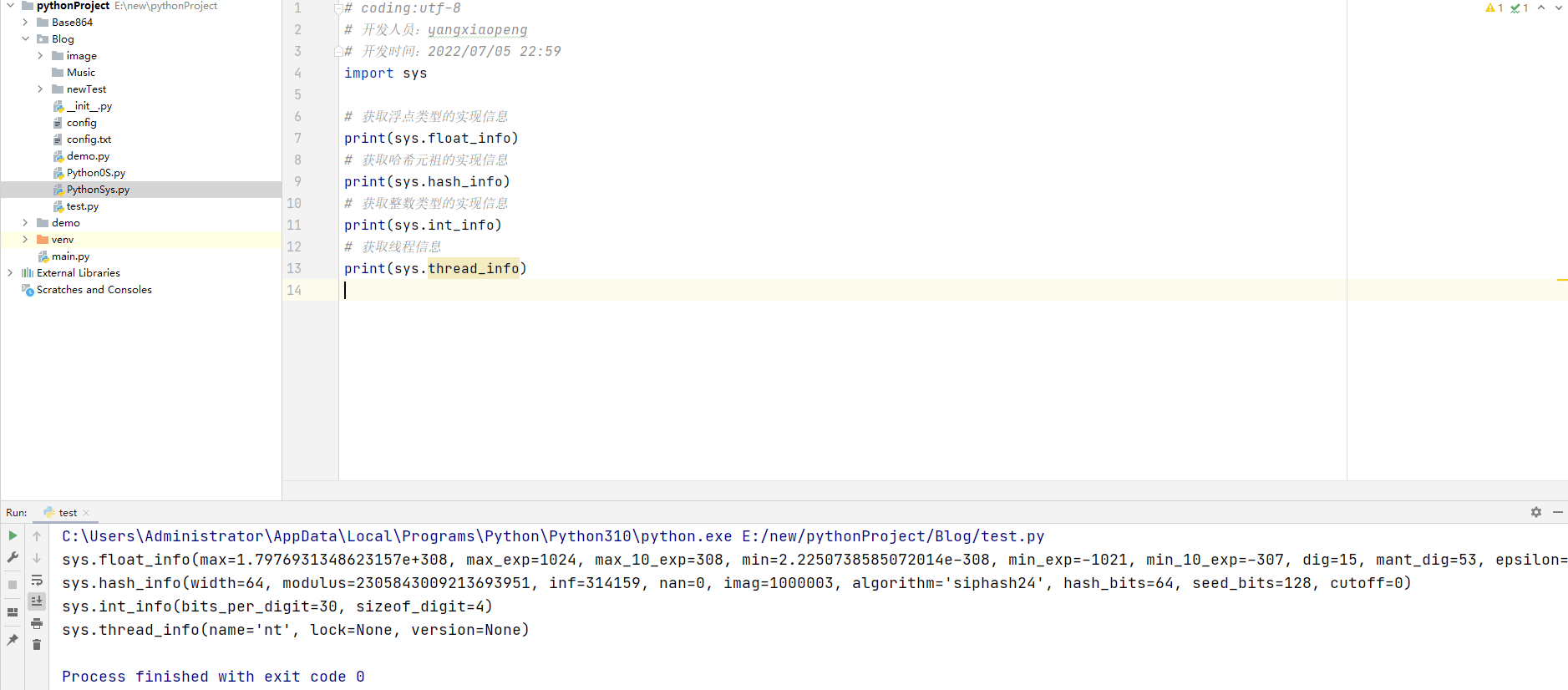 # coding:utf-8 import sys # 获取浮点类型的实现信息 print(sys.float_info) # 获取哈希元祖的实现信息 print(sys.hash_info) # 获取整数类型的实现信息 print(sys.int_info) # 获取线程信息 print(sys.thread_info)