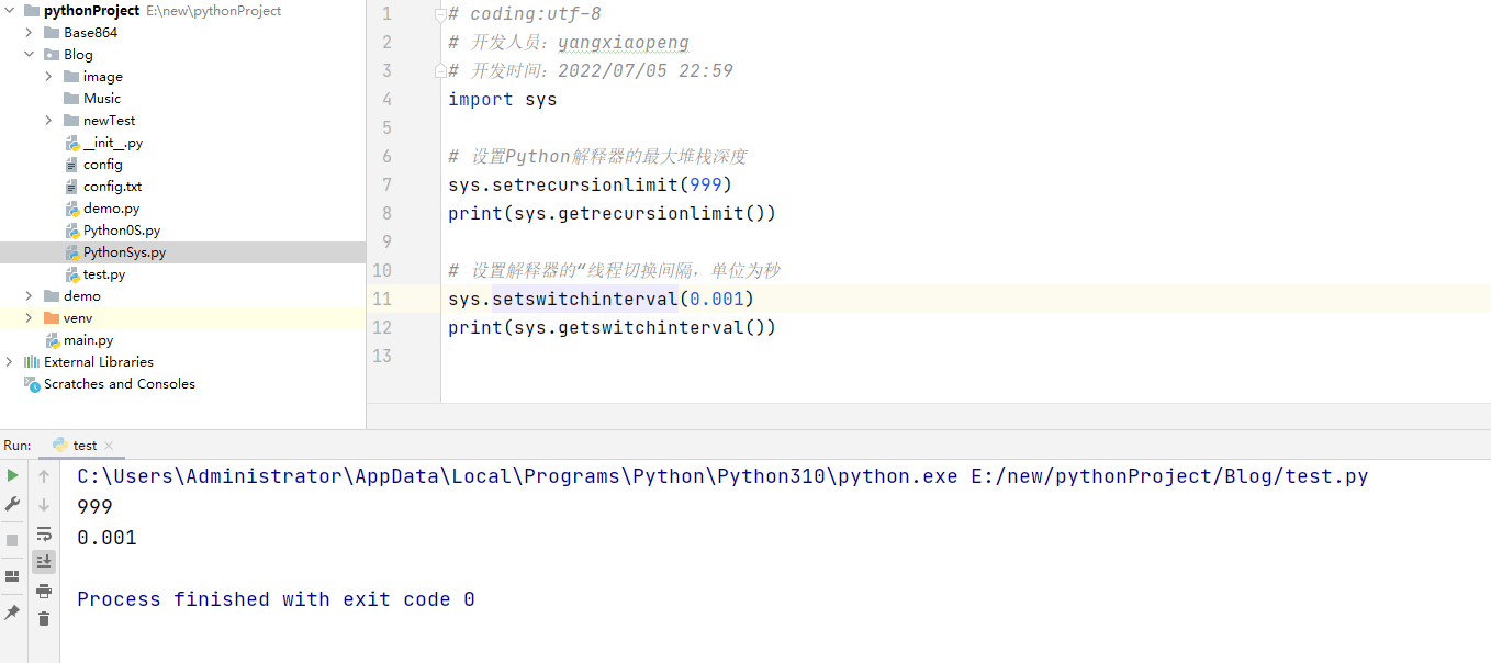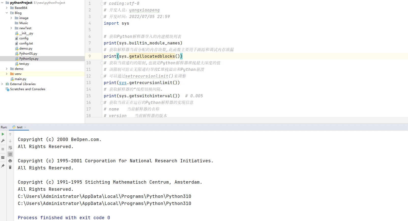 # coding:utf-8 import sys # 获取Python解释器导入的内建模块列表 print(sys.builtin_module_names) # 获取解释器当前分配的内存块数,此函数主要用于跟踪和调试内存泄漏 print(sys.getallocatedblocks()) # 获取当前递归的限制,也就是Python解释器堆栈最大深度的值 # 该限制可防止无限递归导致C堆栈溢出和Python崩溃 # 可以通过setrecursionlimit()来调整 print(sys.getrecursionlimit()) # 获取解释器的“线程切换间隔。 print(sys.getswitchinterval()) # 0.005 # 获取当前正在运行的Python解释器的实现信息 # name 当前解释器的名称 # version 当前解释器的版本 # hexversion 解释器的版本值 # cache_tag 缓存标记信息 print(sys.implementation) # 获取Python解释器是否关闭 print(sys.is_finalizing()) # False # 获取当前程序及解释器信息 print(sys.orig_argv) # 获取Python 解释器的版权信息 print(sys.copyright) # 获取解释器的安装路径信息 print(sys.base_exec_prefix) # 获取解释器的安装路径信息 print(sys.base_prefix) # 获取python的安装路径 print(sys.prefix)