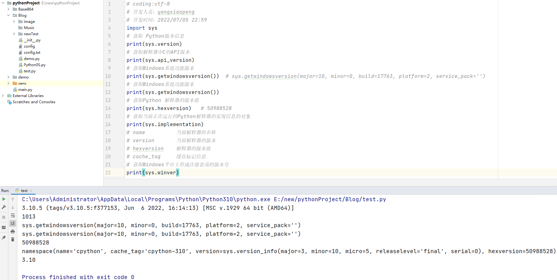# coding:utf-8 import sys # 获取 Python版本信息 print(sys.version) # 获取解释器中C的API版本 print(sys.api_version) # 获取Windows系统功能版本 print(sys.getwindowsversion()) # sys.getwindowsversion(major=10, minor=0, build=17763, platform=2, service_pack='') # 获取Windows系统功能版本 print(sys.getwindowsversion()) # 获取Python 解释器的版本值 print(sys.hexversion) # 50988528 # 获取当前正在运行的Python解释器的实现信息的对象 print(sys.implementation) # name 当前解释器的名称 # version 当前解释器的版本 # hexversion 解释器的版本值 # cache_tag 缓存标记信息 # 获取Windows平台上形成注册表项的版本号 print(sys.winver)