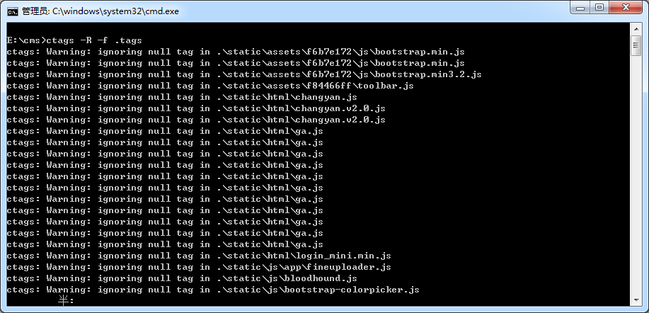 2)在项目根目录打开cmd运行“ctags -R -f .tags”,将生成.tags文件