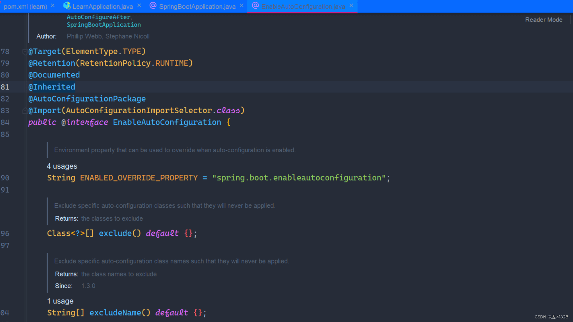 可以看到,自动配置的关键是@EnableAutoConfiguration 注解。