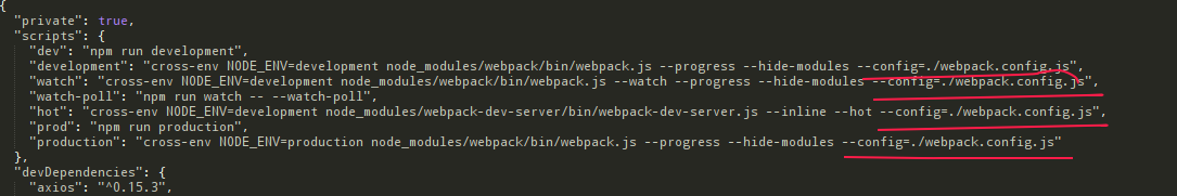 再打开根目录下的package.json修改—config 指向的文件,指向到你现在的这个webpack.config.js文件: