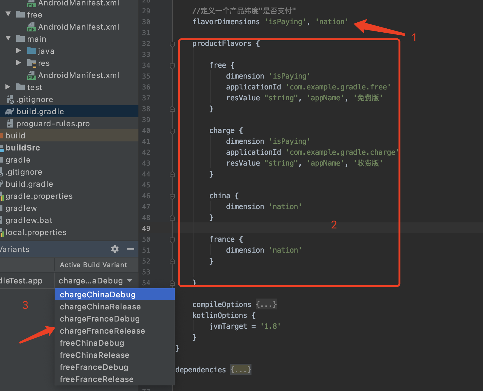 什么是多纬度,比说是否付费是一个纬度,国家是一个纬度,在上图中我又定义了一个 nation 纬度,注意如果你定义了一个纬度那么必须要使用到它,在各个产品风味下通过 dimension 来决定你的风味是使用的哪一个纬度,free 和 charge使用了 isPaying ,china 和 france 使用了 nation,那么多纬度的作用也就是为了更加精细的区分你的APP,如 3 通过这种方式,我完全可以可以打包出不同国家的差异化APP,是不是很灵活呢,不过一般情况下也用不到那么精细,不然这个项目光是维护就很头疼,好,到最后我们可以得出一个公式 【纬度1的产品风味数量】 * 【纬度2的产品风味数量】 * buildType数量 = 最终的APK变体数量。