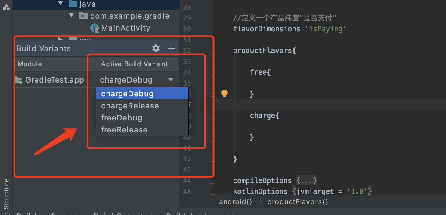 首先我还是修改了 productFlavors 中的代码,定义了一个 resValue,这个参数你可以理解为在不同的风味下定义标签的意思,比如说我在代码中分别为 free 和 charge 风味定义了 resValue 标签,那么在构建他们变体的时候就可以引用到这个标签
