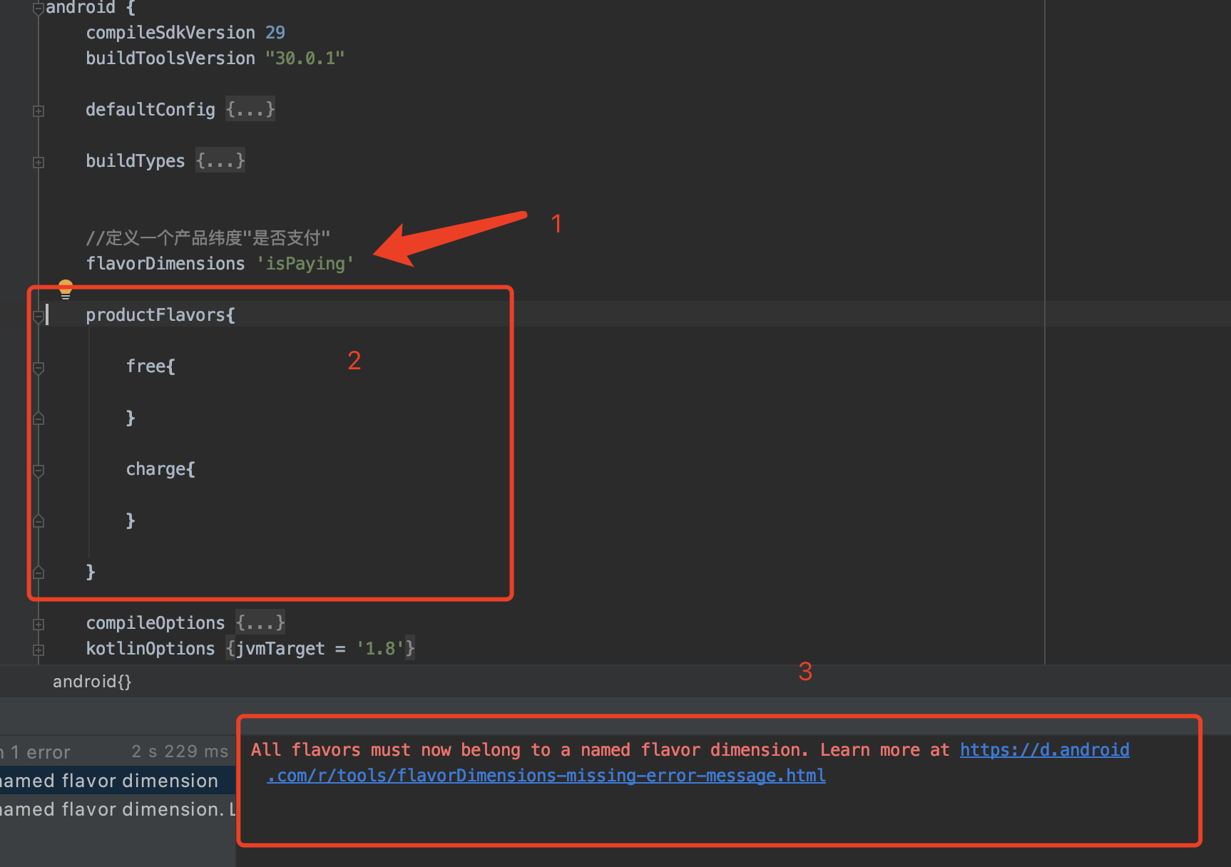 productFlavors 的用法很简单,主要是用来多渠道打包使用,直接在 android 闭包下定义 productFlavors 就可以了,在我的例子中我的APP定位为收费和免费版本,所以我需要在 2 处定义我的“产品风味”也就是我要打包的渠道(收费和免费版本的两个不同APP的渠道),注意下在目前的AS中如果你仅仅只是定义了 代码2 ,那么在构建的时候必然会报 3 处的错误,没有定义产品纬度,所以为了解决这个问题,我们在代码1处定义了一个“是否付费 isPaying ”的纬度。