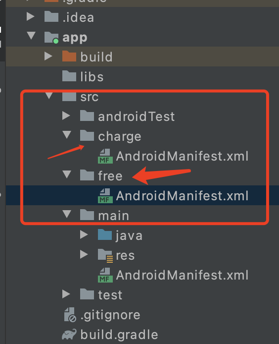 如图,我还新定义了两个文件夹“free”和“charge”,如果你想做差异化的话就必须根据产品风味来定义文件夹,这里因为应用的名称是在清单文件里配置的,所以各自copy了一份,我反正理解的是既然是差异化那么从main里面将有差异的文件copy出来修改就可以了,当然了里面的包名,路径之类的还是得要一致的,讲到这其实大家也就明白了,如果你想在不同的APP页面里做差异化,那么就按照这个套路来就可以了,所以“修改首页(MainActivity)”的任务就交给大家了,自己动手体会下。