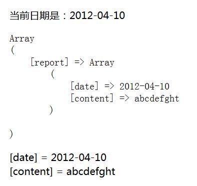 $json = '{"report":{"date":"2012-04-10","content":"abcdefght"}}';