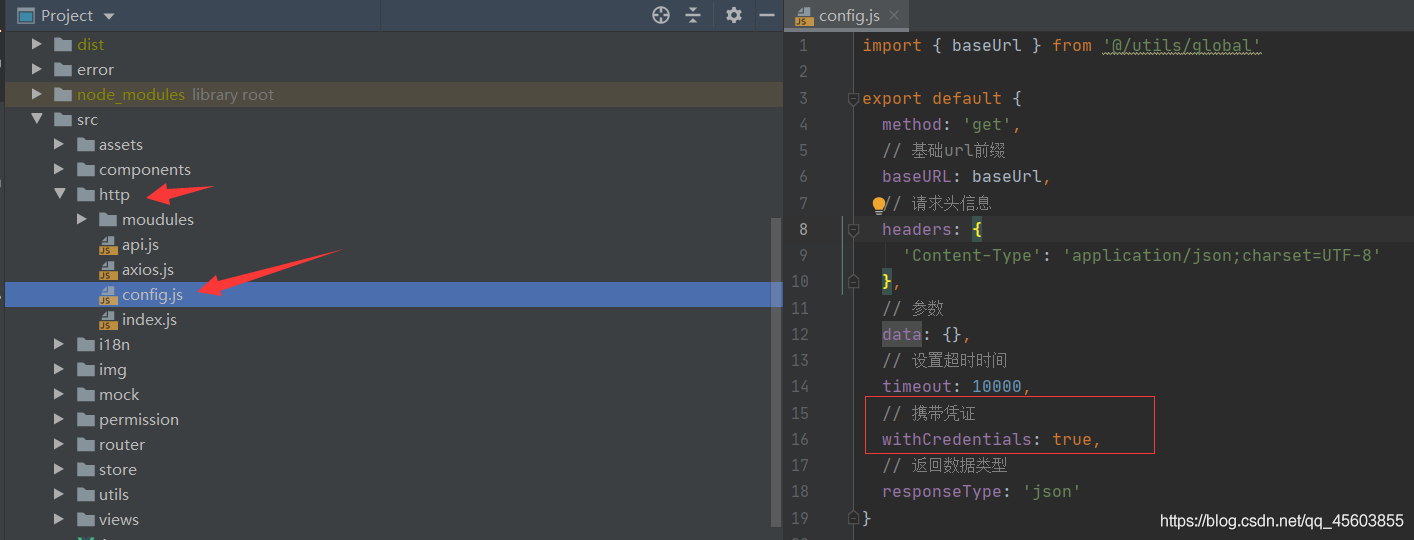 第二步:在vue项目src目录下的http包中的config.js进行配置携带凭证(cookie)