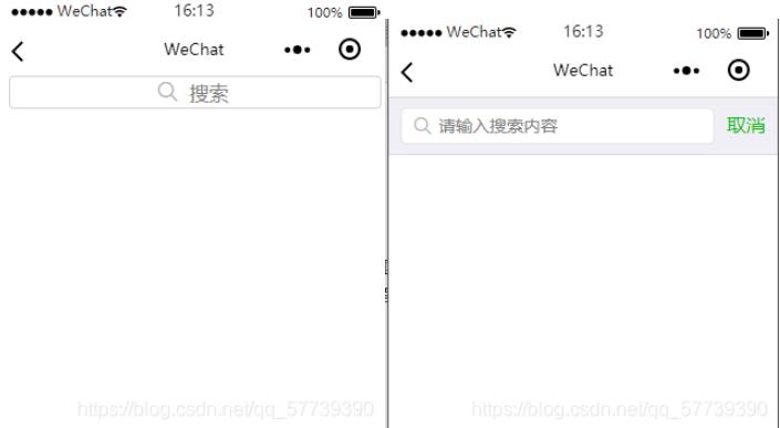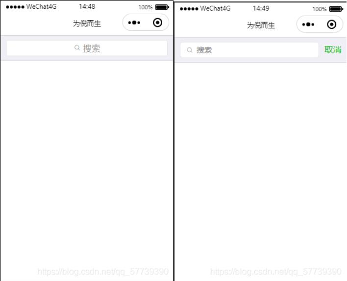 <view> <view> <view class="weui-search-bar"> <view class="weui-search-bar__form"> <!-- 搜索框 --> <view class="weui-search-bar__box"> <icon class="weui-icon-search_in-box" type="search" size="14"></icon> <input type="text" class="weui-search-bar__input" placeholder="请输入搜索内容"/> </view> </view> <!-- 取消搜索 --> <view class="weui-search-bar__cancel-btn" bindtap='hideInput'>取消</view> </view> </view> </view>
