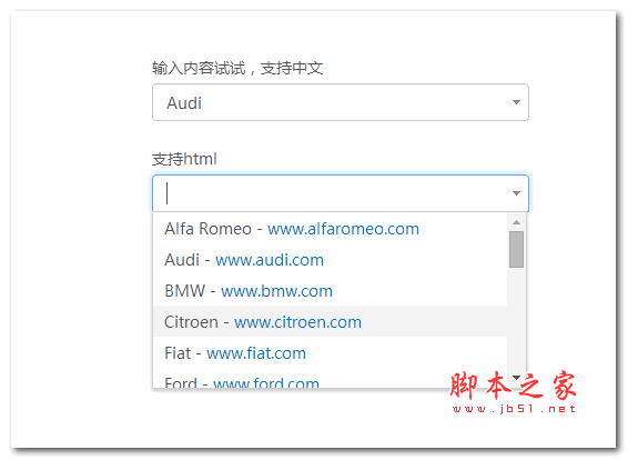 <select id="editable-select"> <option>Alfa Romeo</option> <option>Audi</option> <option>中国人民银行</option> <option>中国人民</option> <option>中国</option> <option>BMW</option> </select>