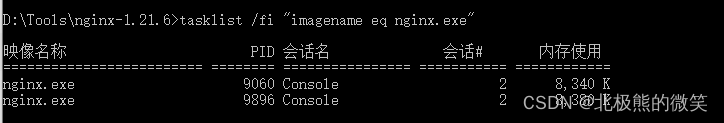 D:\Tools\nginx-1.21.6>tasklist /fi "imagename eq nginx.exe"