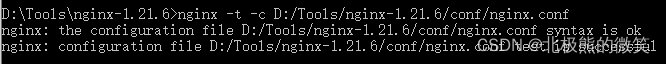 D:\Tools\nginx-1.21.6>nginx -t -c D:/Tools/nginx-1.21.6/conf/nginx.conf