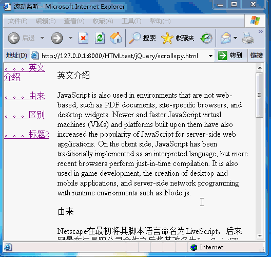 也就是在网页中有点常见的滚动监听。相应的标题,滚到哪里,则左边的滚动条当前标题前的。。。就变成》》》,,当然了,左边的标题同样是可以点击,马上滚到该滚的地方。