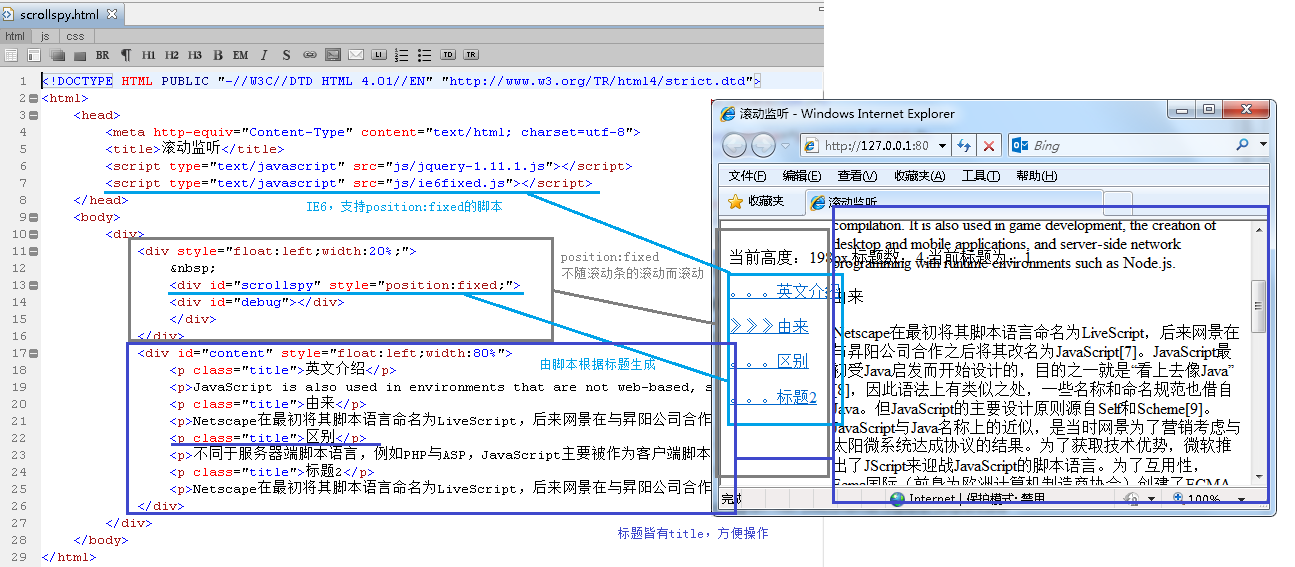$("#debug").html("当前高度:" height_now "px,标题数:" title_counter ",当前标题为:" title_now);//这行只是为了输出信息给大家看清楚,可以没有