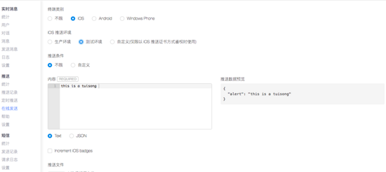 进行到这步了就已经完成了一半了,现在只需要配置推送证书即可接收推送消息,这里就不介绍配置证书流程了,详细步骤请参考 iOS推送证书设置,推送证书设置完成后,现在就去leanclound试试看能不能收到推送吧,退出APP,让APP处于后台状态,