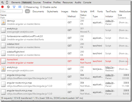 用浏览器打开mobile-angular-ui-master/demo/index.html,发现没加载样式或者js。然后,审查元素后,发现加载的路径不对,于是进行了以下修改