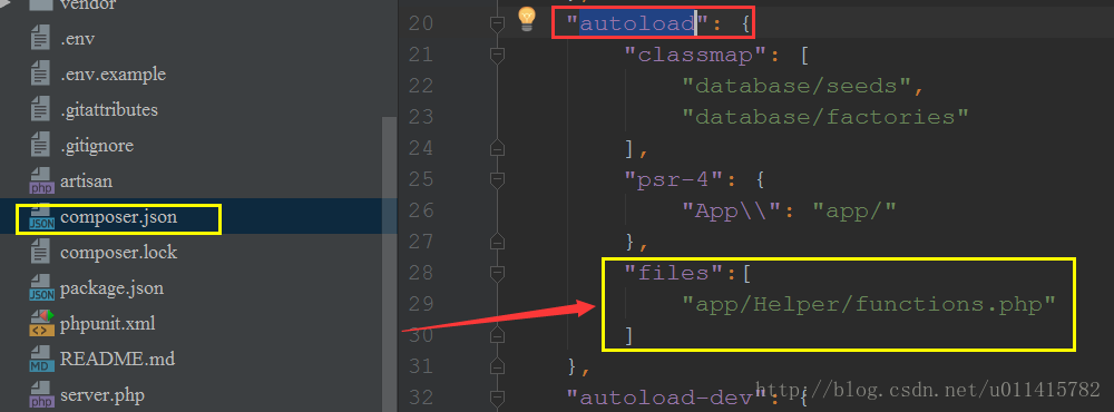 - 打开项目根目录下的 composer.json 文件,找到"autoload" 配置项,补充如下代码: