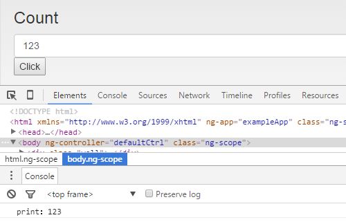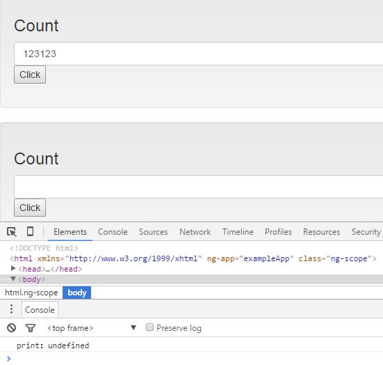 其余代码不变,我只是把放到body 中的属性 ng-controller 放到了两个div中。我重用了defaultCtrl控制器,猜想下,如果我在第一个input标签输入内容,我点击第二个控制器的button按钮,会出现你所期望的结果吗?