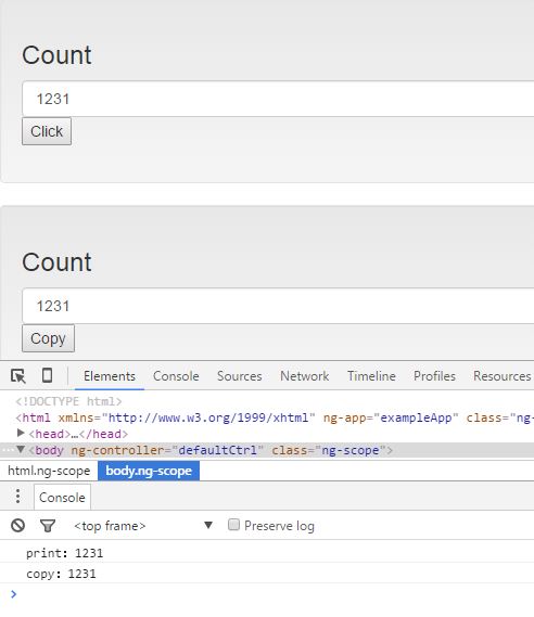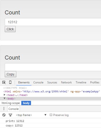 <body > <div class="well" ng-controller="defaultCtrl"> <h>Count</h> <div class="form-group"> <input class="form-control" required ng-model="value" /> <button ng-click="setInput(value)">Click</button> </div> </div> <div class="well" ng-controller="defaultCtrl"> <h>Count</h> <div class="form-group"> <input class="form-control" required ng-model="value" /> <button ng-click="setInput(value)">Click</button> </div> </div> </body>