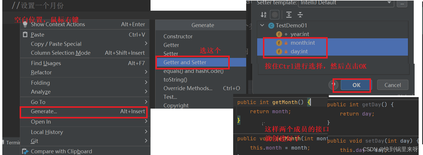 如果说有很多成员都是私有的,我们可以不用一个一个写这两个接口,可以借助idea的功能来快速写出,