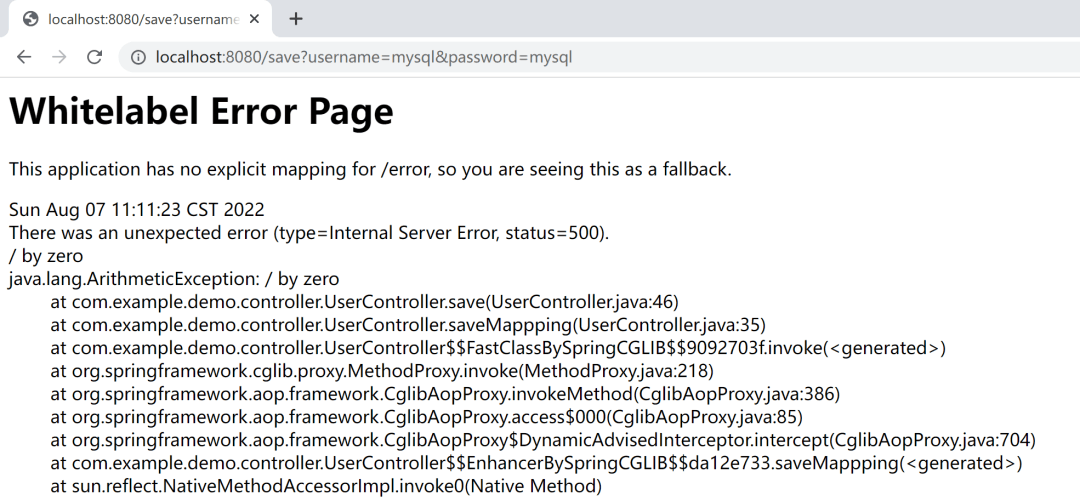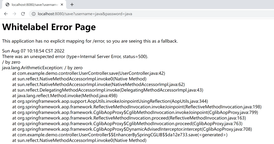以上代码我们在添加方法 save 中添加了 @Transactional 声明式事务,并且添加了异常代码,我们预期的结果是程序出现异常,事务进行自动回滚,以上程序的执行结果如下: