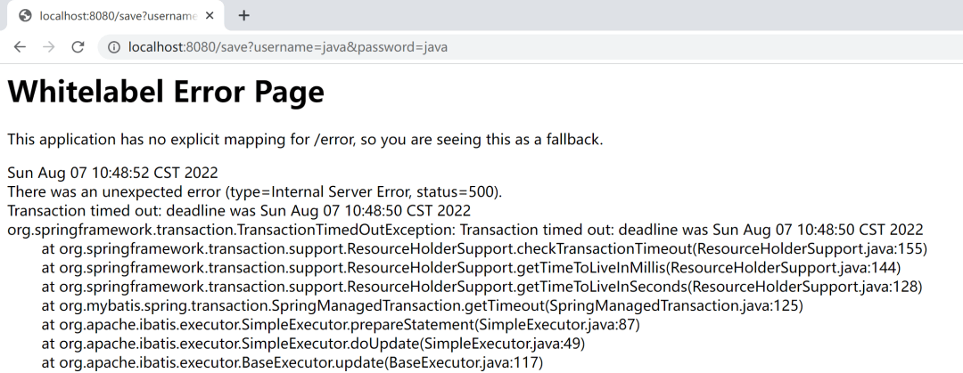 当在 @Transactional 上,设置了一个较小的超时时间时,如果方法本身的执行时间超过了设置的 timeout 超时时间,那么就会导致本来应该正常插入数据的方法执行失败,示例代码如下: