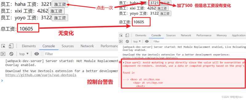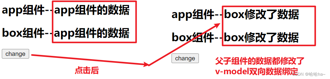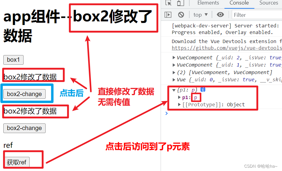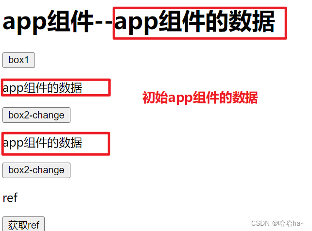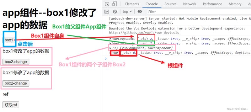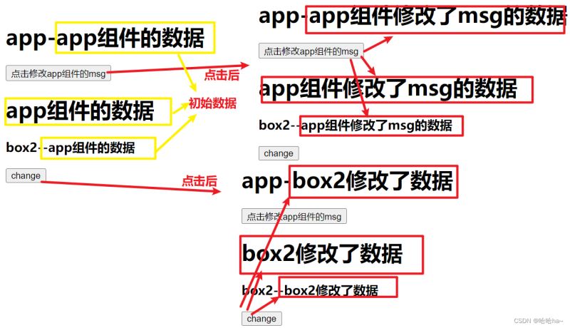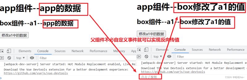 Box2:props:["b1"] 触发上层传下来的App的事件 修改App组件的数据 再更新数据 重新刷新页面