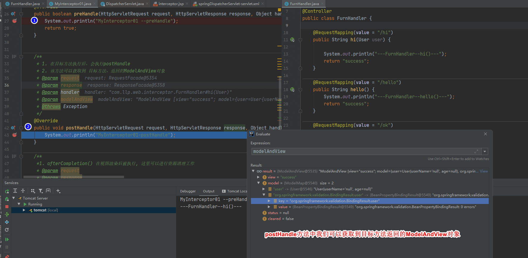 - postHandle 在目标方法被执行后执行. 可以在方法中访问到目标方法返回的 ModelAndView 对象
