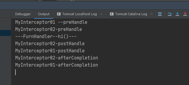 这里我们定义了两个拦截器myInterceptor01和myInterceptor02,两个拦截器都会对ip:port/工程路径/hi的请求进行拦截,执行结果如下图所示: