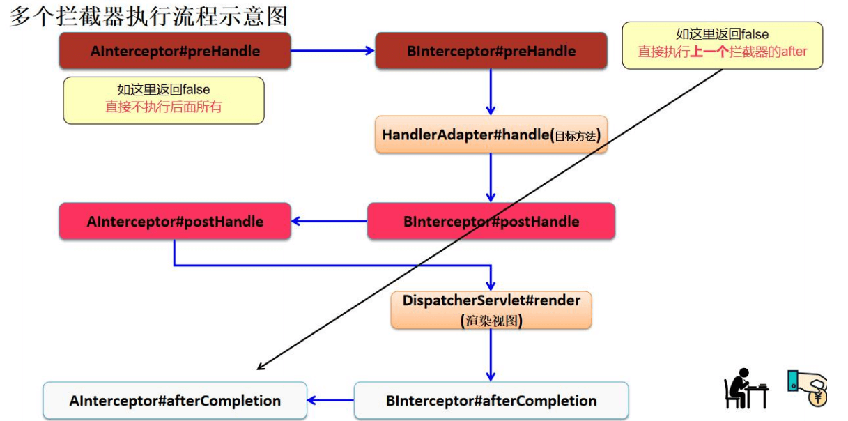 - 如果第2个 拦 截 器 的 preHandle() 返 回 false , 就 直 接 执 行 第1个 拦 截 器 的 afterCompletion()方法, 如果拦截器更多,规则类似