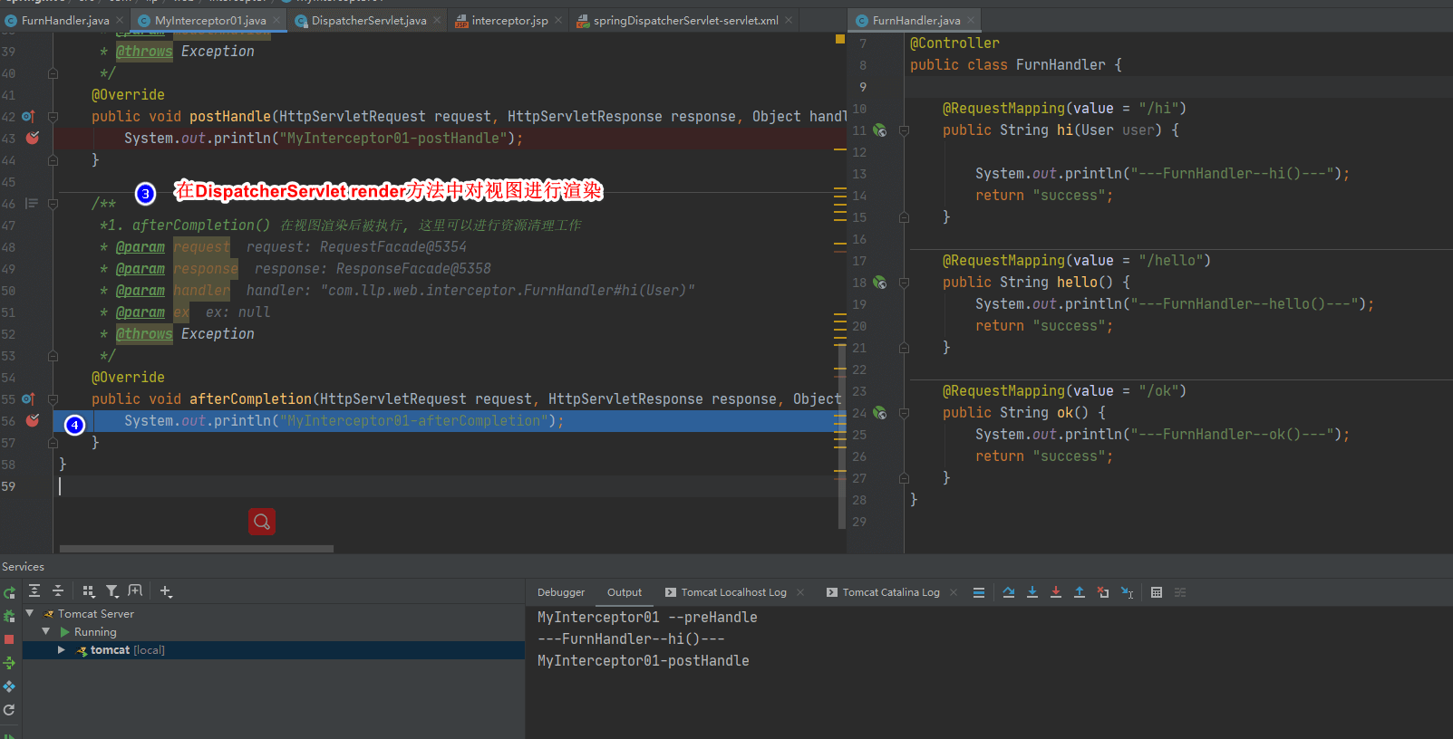 - afterCompletion():这个方法在完全处理完请求后被调用,可以在该方法中进行一些资源 清理的操作。