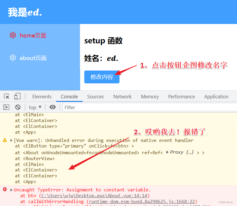 保存上面代码,刷新页面,点击按钮之后,发现姓名没有变成 我是𝒆𝒅. 而是直接报错了。